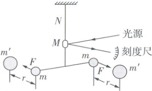 1 [2025浙江嘉兴联考]如图所示,是卡文迪什测量引力常量的实验示意图,弧形刻度尺的圆心正是光线在平面镜$M$上的入射点,半径为$R$。已知两平衡球质量均为$m$,两施力小球的质量均为$m'$,与对应平衡球的距离均为$r$,施加给平衡球的力水平垂直平衡杆,反射光斑在弧形刻度尺上移动的弧长为$\Delta l$。两平衡球受到的等大反向且垂直水平平衡杆的水平引力$F$与石英丝$N$发生扭转的角度$\Delta \theta$成正比,即$F = k\Delta \theta$,$k$为常量,$\Delta \theta$可以通过反射光斑在弧形刻度尺上移动的弧长求出来。测得引力常量为 ( )