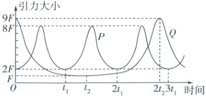 5(多选)[2025重庆育才中学期中考试]卫星$P$、$Q$绕某行星运动的轨道均为椭圆,只考虑$P$、$Q$受到该行星的引力,引力大小随时间的变化如图所示,已知$t_{2} = \sqrt{2}t_{1}$。下列说法正确的是 ( )