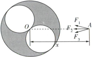 1 质量均匀分布、半径为 $ R $ 的球体,在与球心 $ O $ 距离 $ x(x > R) $ 处有一质点 $ A $。现从球体中挖去两个半径为 $ \frac{R}{2} $ 的球体,三个球体相切且球心与切点共线,如图所示。则剩余部分对质点 $ A $ 的万有引力的方向( )