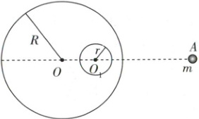 4(多选)如图所示,在质量为 $ M $ 且均匀分布的半径为 $ R $ 的球内挖去半径为 $ r $ 的球,在球外两球的球心连线上距球表面 $ R $ 的位置放一质量为 $ m $、可视为质点的小球 $ A $。已知 $ r = \frac{1}{4}R $,两球心 $ O $、$ O_1 $ 间距离为 $ \frac{R}{2} $,质量分布均匀的球壳对壳内物体的万有引力为零。下列说法正确的是( )
