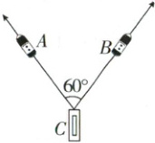 4 如图所 着驳船$C$运 和$2v$,方向沿着 间的夹角为$60^{\circ}$。由 速度在$CA$、$CB$方向的投 相等,由此可知该时刻$C$的
