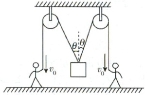 2 (多选)如图所示,两个人通过两个定滑轮以恒定的速度$v_{0}$拉一个大木箱,绳子与竖直方向的夹角都是$\theta$,则下列说法正确的是 ( )