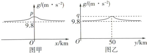 2 [2025 广东佛山模拟考试]地质勘探人员利用重力加速度反常(如地面下方有重金属矿时,重力加速度值比正常值大)可探测地面下的物质分布情况。在地面下某处(远小于地球半径)有一重金属矿,探测人员从地面上 $O$ 点出发,沿水平地面上相互垂直的 $x$、$y$ 轴两个方向,测量不同位置的重力加速度值,得到重力加速度值随位置变化如图甲、乙所示,图像的峰值坐标分别为 $(0,p)$ 和 $(50\ km,q)$。由此可初步判断( )