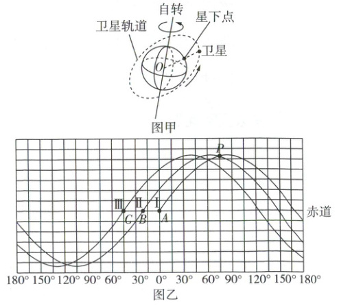 4 新情境(多选)[2025 广东佛山期中考试]星下点轨迹是卫星运动轨迹垂直向下在地球表面的投影。某颗卫星绕地球做匀速圆周运动,卫星轨道和绕行方向如图甲所示。图乙是卫星第Ⅰ圈、第Ⅱ圈和第Ⅲ圈的星下点轨迹展开图,横轴数值表示经度。其中 $P$ 点是第Ⅰ、Ⅱ圈星下点轨迹展开图的一个交点。已知地球自转周期为 $24\ h$,卫星轨道半径约是地球半径的 $1.084$ 倍。下列说法正确的是( )