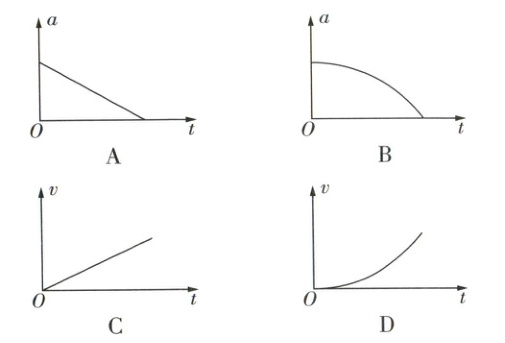1 B 设地球的密度为$\rho$,当物块距地心的距离为$x$时,受到的万有引力为$F=G\frac{Mm}{x^{2}}$,其中$M = \rho · \frac{4}{3}\pi x^{3}$,解得$F=\frac{4\pi\rho Gxm}{3}$,根据牛顿第二定律可得加速度为$a = \frac{F}{m} =\frac{4\pi\rho Gx}{3}$,因$x$越来越小,所以加速度$a$越来越小;$a - t$图像斜率为$\frac{\Delta a}{\Delta t} =\frac{4\pi\rho G}{3} · \frac{\Delta x}{\Delta t} =\frac{4\pi\rho G}{3}v$,因物块向地心下落,速率越来越大,故$a - t$图像斜率的绝对值增大,故A错误,B正确;速度—时间图像的斜率是加速度,由以上分析可知,加速度越来越小,故CD错误。