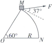 4 如图所示 (俯视图),水平桌面上,长 $ 6\ m $ 的轻绳一端固定于 $ O $ 点,另一端系一质量 $ m = 2.0\ kg $ 的物块。现对物块施加一个沿桌面且大小不变的力 $ F = 10\ N $,$ F $ 拉着物块从 $ M $ 点运动到 $ N $ 点,$ F $ 的方向始终与物块的运动方向成 $ 37^{\circ} $ 角。已知物块与桌面间的动摩擦因数 $ \mu = 0.2 $,不计空气阻力,取 $ g = 10\ m/s^2 $,$ \sin 37^{\circ} = 0.6 $,$ \cos 37^{\circ} = 0.8 $,则下列说法正确的是 ( )