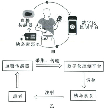 21. “智能化胰岛素泵”是一种调节糖尿病患者体内血糖含量的仪器,其主要由贴于上臂皮肤的血糖传感器、别于腰间的胰岛素泵和手机端的数字化控制平台三部分构成(如图甲)。该仪器可实现血糖的全天动态调节,其工作原理可简化为图乙。