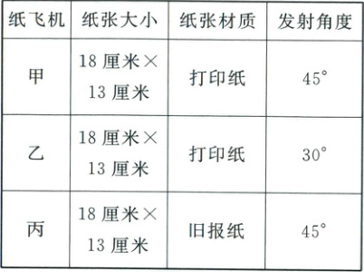 。(4)小组成员又制作了三架形状相同的纸飞机,用该发射器以相同大小的发射速度进行实验,实验要求如表2。若甲、乙、丙这三架纸飞机飞行距离分别为s甲、s乙、s丙,请预测它们的大小关系
