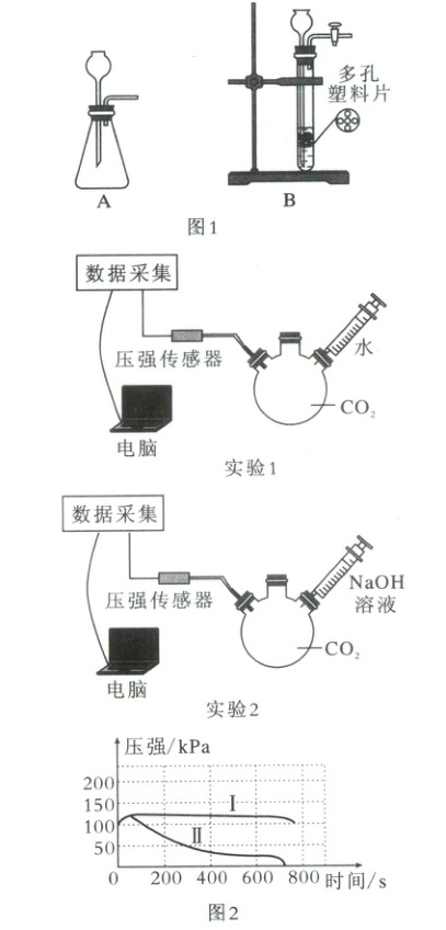 (2)小组同学用如图2装置研究二氧化碳与氢氧化钠的反应,用注射器分别注入等体积的水和氢氧化钠溶液,测得压强随时间变化的图象如图曲线Ⅰ和Ⅱ所示。