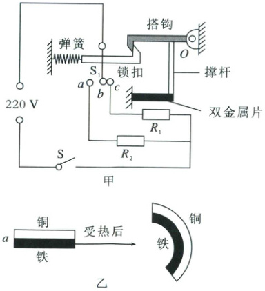 (3)保温电阻R₂工作,保温时弹簧拉动S₁和锁扣往左运动,触点b与a接触,虽然双金属片冷却恢复原状,搭钩左侧下降,但是锁扣并未复位,搭钩无法钩住锁扣使触点b与c接触。