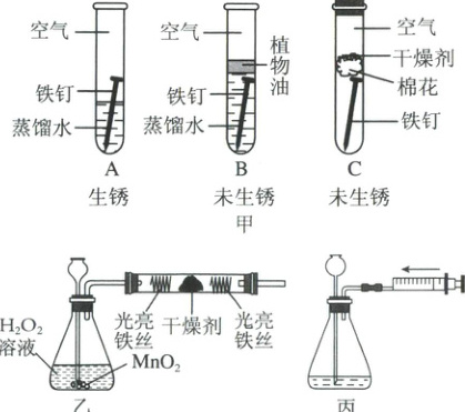 (1)图甲实验中,对比A、C可知:铁生锈与
