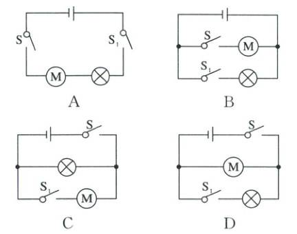 14. 电动独轮车是新一代的节能、环保、便携的代步工具。其工作原理是当电源开关$S$闭合时指示灯$L$亮起,车处于待机状态;当人再站到车上时开关$S_{1}$自动闭合,电动机$M$才能工作,以下电路设计符合要求的是(