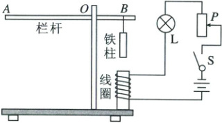。(1)已知该电路电源电压为$6$伏,指示灯$L$工作时的阻值为$5$欧,滑动变阻器接入电路的阻值为$10$欧,线圈阻值不计。闭合开关后,线圈吸住铁柱时,指示灯的功率为