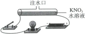 (1)小科闭合开关后,将适量KNO₃水溶液从注水口倒入塑料管中时观察到小灯泡发光,说明KNO₃水溶液是