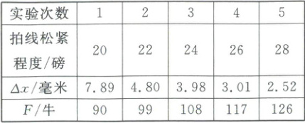 26. 某科研小组为了探究羽毛球撞击球拍时,球拍所产生最大力与拍线松紧程度(单位:磅)的关系,进行如下实验:①选择5支相同的球拍,将拍线松紧程度分别调节为20、22、24、26、28磅;②先使羽毛球撞击拍线松紧程度为20磅的球拍拍面中心位置A,拍面中心位置A最终移动到B点,测出AB的距离为Δx;③测出球拍拍面中心位置A移动Δx距离后(即B点)的力F;④然后换用拍线松紧程度分别为22、24、26、28磅的球拍,重复步骤②③,记录的实验数据如下表: