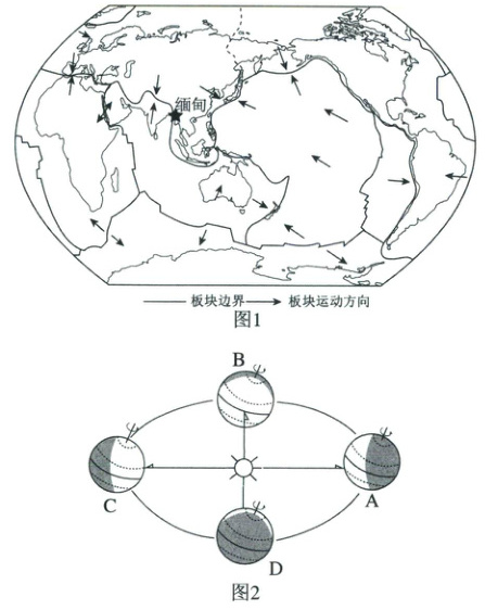 (1)缅甸地震发生时,地球公转至图2中________(填“A”“B”“C”或“D”)位置附近。