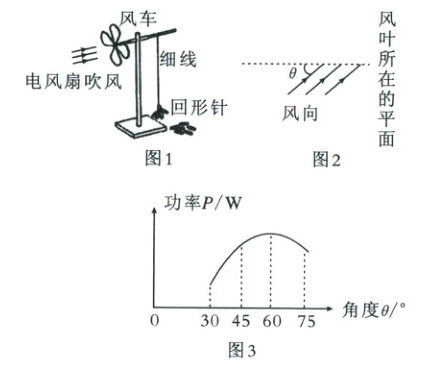 23. (9分)风能是一种低碳、清洁的能源。如图1所示为某学校科学兴趣小组设计的一款测量风车功率的装置,小组成员通过查阅资料得知,风车功率与风速、风叶质量、风叶长度等有关。除以上因素以外,为了研究风车功率与风向和叶片夹角的关系,他们展开如下实验: