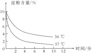 相同时间内,37℃试管中的淀粉含量比36℃试管中的淀粉含量低(或37℃时淀粉分解速度比36℃时分解速度更快)