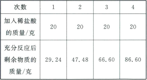 33. (8分)牡蛎,又名蚝,蚝壳中含有大量碳酸钙(其他成分不溶于水也不与酸反应)。小科为测定蚝壳中碳酸钙的含量,取11克搞碎的蚝壳置于烧杯中,分批次加入质量分数为14.6%的盐酸,每次加入盐酸充分反应后,测量烧杯中剩余物质的总质量(忽略过程中H₂O的蒸发和HCl的挥发),数据记录如下表所示。