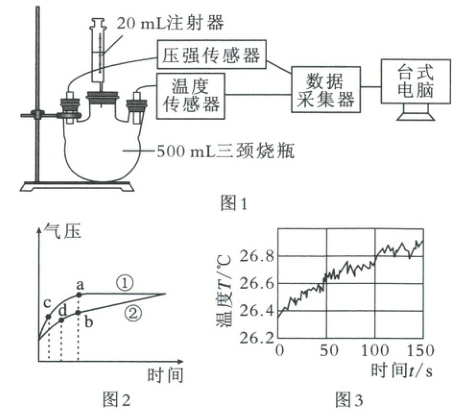 分别取等质量块状和粉末状的蛋壳样品与等体积、等浓度的稀盐酸在如图$1$的三颈烧瓶中反应,采集数据,形成如图$2$和图$3$的图象。