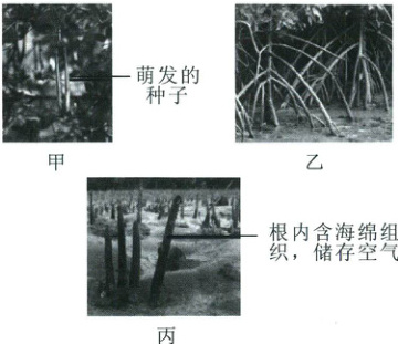 。(3)红树林生长在潮涨潮落,风浪大,土壤松软的环境里。因此红树植物进化出了不同功能的根系以适应这种环境,如图乙和丙为两种不同红树植物的根系图,请选择其一推测其功能。