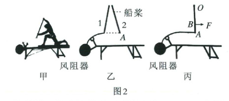如图甲是运动员在室内进行划桨训练的场景,图乙是训练装置的结构示意图,通过对风阻器的调节可以设置不同的阻力,绳子系在“船桨”的$A$端,运动员坐在位置上用力将“船桨”从位置“$1$”划到位置“$2$”,从而对运动员起到训练力量的作用。