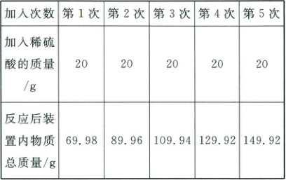 (2)小龙同学了解到,“铜牌”是铜锌合金制成的。为测定某“铜牌”样品中铜的含量,小龙称取制作该铜牌的材料$50g$放入如图装置中,将$100g$稀硫酸分$5$次加入,记录每次反应后装置内物质的总质量。实验数据如下表: