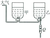 25. 如图所示,该装置是某医院内给病人输液的部分装置示意图,乙瓶内液体不断通过$Q$管输人病人体内,刚开始输液时,甲、乙两瓶内药液量相等,液面相平。过了一会儿,观察两个输液瓶时会发现(此时两个输液瓶内还有大量的溶液)(