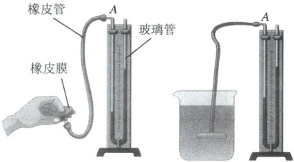 29. 如图所示为压强计的构造,通常用压强计研究“液体内部压强与深度的关系”。在实验中,某同学把橡皮膜直接放到水杯底部,这时$A$处的橡皮管与玻璃管互相脱开,他立即去观察玻璃管中的液体,看到的现象会是怎样的?