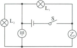 31. 如图所示,开关$S$闭合后,两灯均能发光,两电表的指针均有偏转,已知电源电压为$6\ V$,$L_1$的电阻为$12\ \Omega$,$L_2$的电阻为$24\ \Omega$,则甲电表的示数为