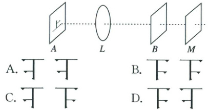 19. 如图为某一光学系统的平面示意图,其中L为凸透镜,A为垂直于透镜中心轴线的物平面,M为与透镜中心轴线垂直的平面镜,B为用毛玻璃做成的垂直于透镜中心轴线的屏幕,由于屏幕为半透明,所以无论在屏幕的左侧还是右侧都可以看到A经透镜在屏幕上所成的实像。如果物是A面上的一个发光的“上”字,则在位于B、M之间的观察者看来屏幕B上和平面镜M中的像的形状分别为(