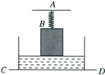 31. (8分)如图所示,一个质量为300克薄壁长方体容器放在水平硬板CD上,容器底面长15厘米,宽10厘米,容器高度为20厘米,装有10厘米深的水。一根原长为10厘米的轻质的细弹簧AB吊着长方体木块静止,木块下表面刚好与水面接触。弹簧上端A连接着固定不动的支架,下端B连接在木块上表面的中心处,弹簧每拉长或者压缩1厘米需要0.5牛,木块的重力为2.5牛,底面长5厘米,宽5厘米,高度为20厘米。现将水平硬板CD缓慢向上移动,木块始终保持竖直方向,弹簧均在弹性限度内,木块不吸水。求:(g取10牛/千克)