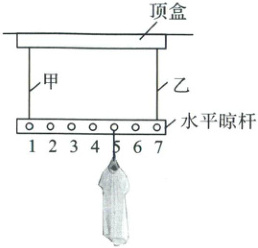 34.(6分)如图所示为自动升降单杆晾衣架,顶盒中有牵引装置,甲、乙是连接牵引装置和水平晾杆的竖直钢丝绳,水平晾杆上有7个挂衣孔,相邻两孔间距相等,甲、乙钢丝绳悬挂晾杆的点分别与1号、7号孔中心对齐。现把重为30N的衣服(含衣架)挂在5号孔(不计晾杆和绳的重力,不计摩擦和空气阻力)。