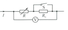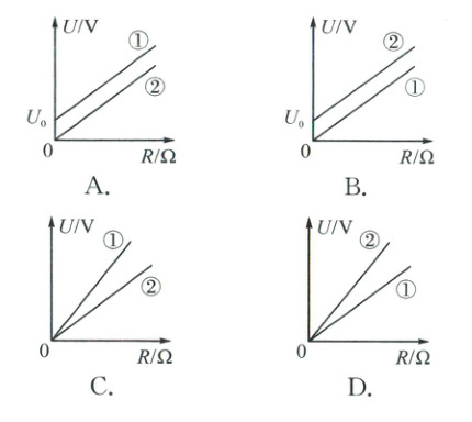 15. 如图,电路中电流$I$大小始终不变,$R_{0}$为定值电阻。闭合开关$S$,据电压表示数$U$与电阻箱阻值$R$的大小关系可以绘制$U-R$图象①;断开开关$S$,据电压表示数$U$与电阻箱阻值$R$的大小关系可以绘制$U-R$图象②。把$IR_{0}$记为$U_{0}$,下列能正确表示图象①、②的是(