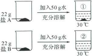12. $NH_{4}Cl$、$KNO_{3}$是两种盐。$30^{\circ}C$时,$NH_{4}Cl$的溶解度为$41.4g/100g$水,$KNO_{3}$的溶解度为$45.8g/100g$水。取这两种盐各$22g$,按图示进行实验。下列说法错误的是(