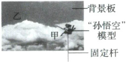 10. 如图是模拟孙悟空“腾云驾雾”的拍摄装置,该装置主要由“孙悟空”模型和“蓝天白云”背景板组成。为了让孙悟空从背景板的甲处移到乙处,一般有两种方式:第一种是背景板相对于地面静止,移动孙悟空;第二种方式是孙悟空相对于地面静止,移动背景板。如果采用第二种方式,背景板按下列方向移动可以实现的是(