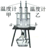 。(2)实验过程中,小宁观察到温度计甲的示数变化始终比乙快。由此可知,液体$a$的比热$c_{a}$与液体$b$的比热$c_{b}$的大小关系是:$c_{a}$