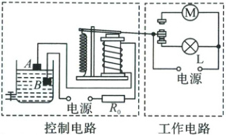 21. 如图所示是小宁设计的水位自动控制电路,其中工作电路由指示灯L、电动机M等元件组成,由家庭电路供电;控制电路中,金属板A、B置于水箱中不同位置,水箱中的天然水是导体。