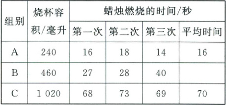 。(3)小明发现$B$组第三次实验时,橡皮泥未完全封住烧杯尖嘴口。为此,增做了第四次实验,测得蜡烛燃烧的时间为29秒。则$B$组蜡烛燃烧的平均时间为