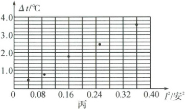 ④再将电流值分别设定为0.3安、0.4安、0.5安、0.6安,重复上述步骤。记录相关数据,并计算每次升高的温度$\Delta t$($\Delta t$可反映电热的多少),整理$\Delta t$、$I^2$的数据如图丙。