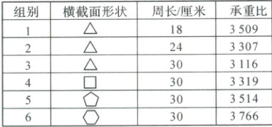 (1)研究模型承重效率与横截面形状关系时,除横截面周长、高度相同外,还要控制相同的因素有