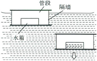 29. 我国某地使用“沉管法”建跨海隧道:用钢筋水泥等材料浇筑若干个中空管段,用隔墙封闭两端并使其漂浮在水中;用拖船牵引至指定位置,向管段中的水箱注水使其下沉(如图);对下沉的多个管段进行依次连接,拆除隔墙形成隧道。
