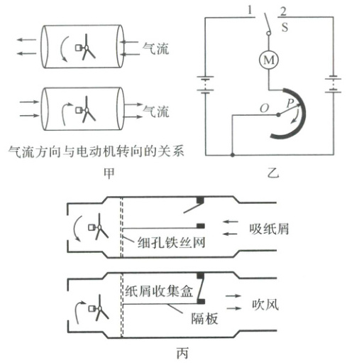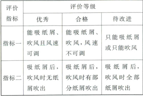 28. 项目学习小组实验发现,装在筒内的电动机带动风叶转动时,电动机转动方向改变,气流方向也改变,如图甲所示。于是想利用带风叶的电动机制作一款“书桌神器”:既能收集书桌上的小纸屑,又能吹风纳凉。他们制作的产品评价表如下。