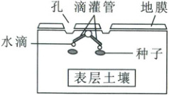 30.播种前铺上地膜有利于土壤保温、保湿;待温度适宜时在种子处滴灌,使种子有充足的水分、适宜的温度;滴灌使土壤不易板结、透气性好使种子萌发有充足的空气,从而提高种子萌发率。滴灌使种子周围土壤含水量少不易发生虫害,又能减缓表层土壤盐分升高,有利于幼苗吸水;种子播种深度浅等条件有利于幼苗出土。