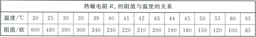 32. 在献爱心活动中,小明为敬老院老人设计了一款智能电热坐垫,能实现加热后自动保温。该坐垫电路如图甲,$R_a$是安装在坐垫内的热敏电阻,其阻值随温度的变化如表所示。