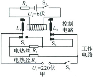 闭合开关$S_1$、$S_2$,电热坐垫启动高功率工作模式,当通过电磁铁的电流达到0.05安时,衔铁$L_a$和$L_b$同时被吸引,转为低功率工作模式。当坐垫温度降低使通过电磁铁的电流为0.04安时,电磁铁无法吸住衔铁$L_a$和$L_b$,$L_a$、$L_b$恢复原位,又转为高功率工作模式。电热坐垫在高功率和低功率模式之间切换,使其温度维持在一定范围。