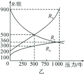 现有三种力敏电阻$R_b$、$R_c$、$R_d$,其阻值随压力变化如图乙所示。写出你选择的力敏电阻以及在控制电路中的连接方式,并写出500牛压力下坐垫的最高温度值:______。(线圈阻值忽略不计)