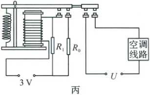 实际使用中发现:当气温在30℃上下波动时,空调线路会频繁接通和断开,影响空调的正常使用。因此该同学在图甲的基础上增加了一个定值电阻R₀(如图丙),实现了空调线路接通后,气温降低至26℃以下时才自动切断,回升至30℃后才重新接通。请计算R₀的阻值,并说出“气温从30℃降低至26℃时,空调线路不断开”的工作原理。(电路改进前后,衔铁刚被吸下时,电磁铁线圈中的电流大小不变;线圈电阻忽略不计)