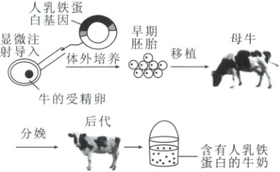 7. 科学家利用转基因技术将人乳铁蛋白基因导入奶牛的受精卵中,最终培育出的转基因奶牛,能产出含人乳铁蛋白的牛奶,具体流程如图。下列说法正确的是(