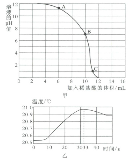 通过$pH$传感器和温度传感器完成以下实验:向$40mL$溶质质量分数为$0.4\%$的氢氧化钠溶液中逐滴加入稀盐酸,测定溶液的$pH$随滴入稀盐酸体积的变化情况如图甲所示,利用温度传感器测得反应过程中溶液温度随时间变化的曲线如图乙所示。